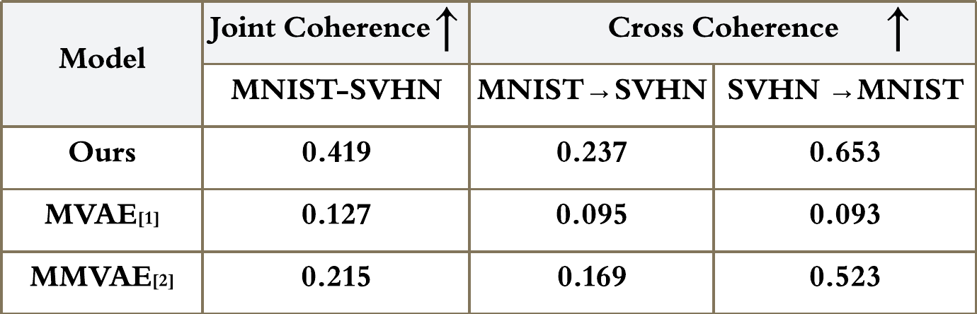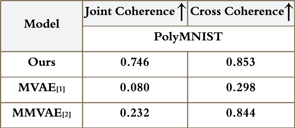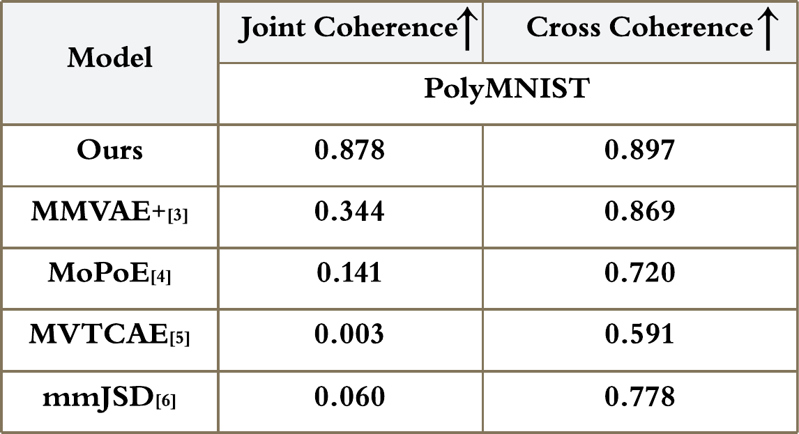 Our proposed multimodal generative model with EBM prior generate image with highly consistant digit information both in clean and noisy background. The qualitative results are shown in Figure 1. We further evaluate our model quantitatively by using Joint Coherence and Cross Coherence in the table below. It can be seen that our model achieves superior generation performance compared to listed baseline models.
