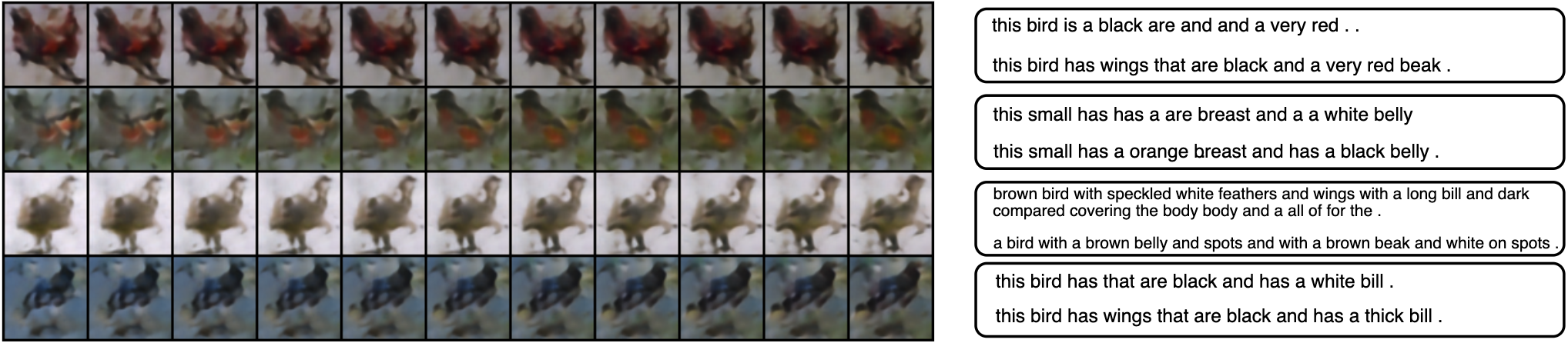 We examine the exponential tilting of the reference prior \(p_0(z)\) through Langevin samples initialized from \(p_0(z)\) with target distribution \(p_\alpha(z)\). As the reference distribution \(p_0(z)\) is in the form of an Laplacian, we expect the energy-based correction \(f_\alpha\) to tilt \(p_0\) into an irregular shape like some shallow local modes. Therefore, the trajectory of a Markov chain initialized from the reference distribution \(p_0(z)\) with well-learned target \(p_\alpha(z)\) should depict the transition towards more coherent information between image and caption. Figure 4 depicts such transitions for CUB, which is based on a model trained with 50 steps. The quality of synthesis improves significantly with increasing number of steps.